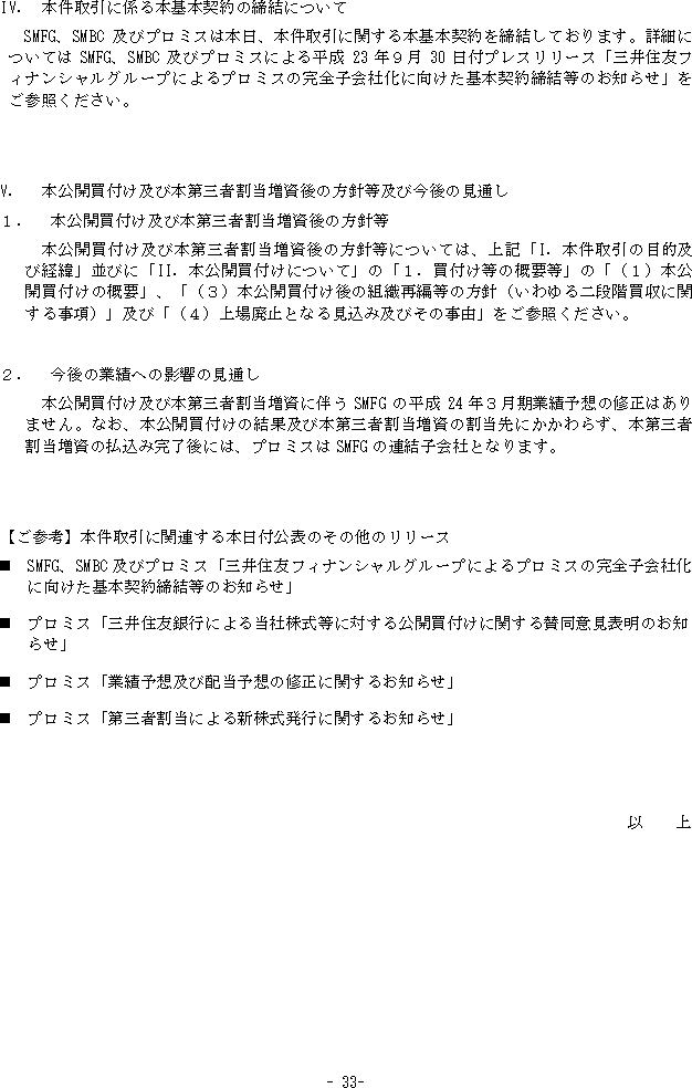 三井住友銀行によるプロミスに対する公開買付けの開始及び三井住友フィナンシャルグループ又は三井住友銀行によるプロミスの第三者割当増資の引受けのお知らせ(33/35)