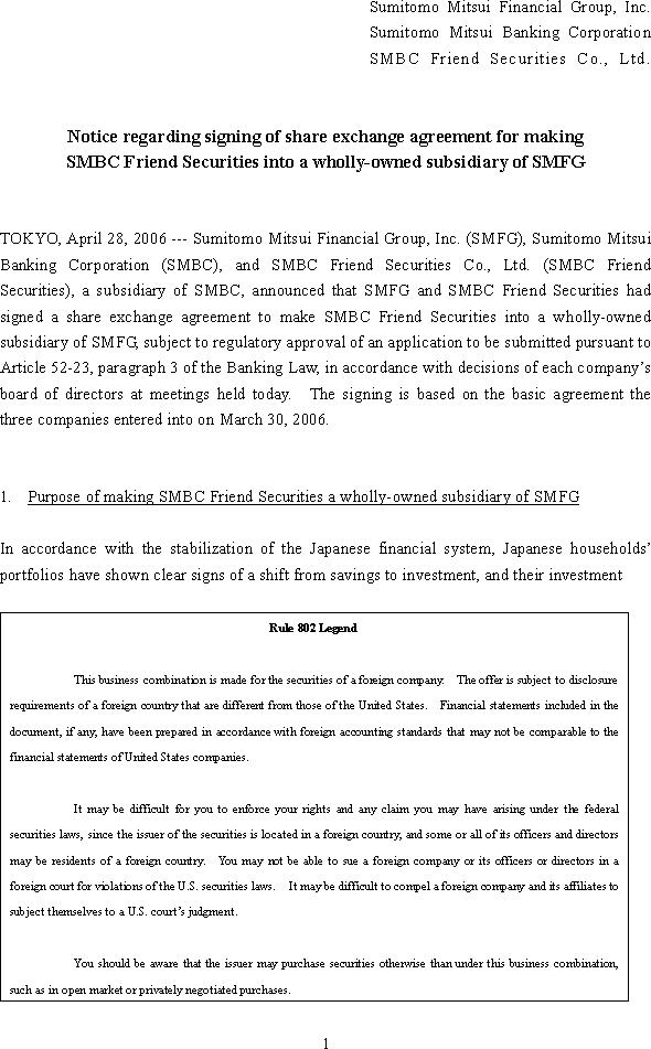 SMFG TOP > News Releases > Notice regarding signing of share exchange agreement for making SMBC Friend Securities into a wholly-owned subsidiary of SMFG(1/6)