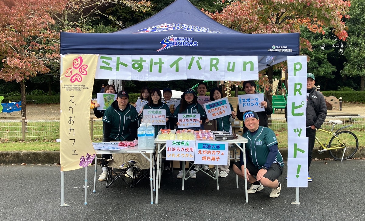 ランナーの皆さまへ茨城県産品、筑波大付属特別支援学校が運営する「えがおカフェ」の焼き菓子を配布し、茨城県の魅力と特別支援学校の活動を発信しました。