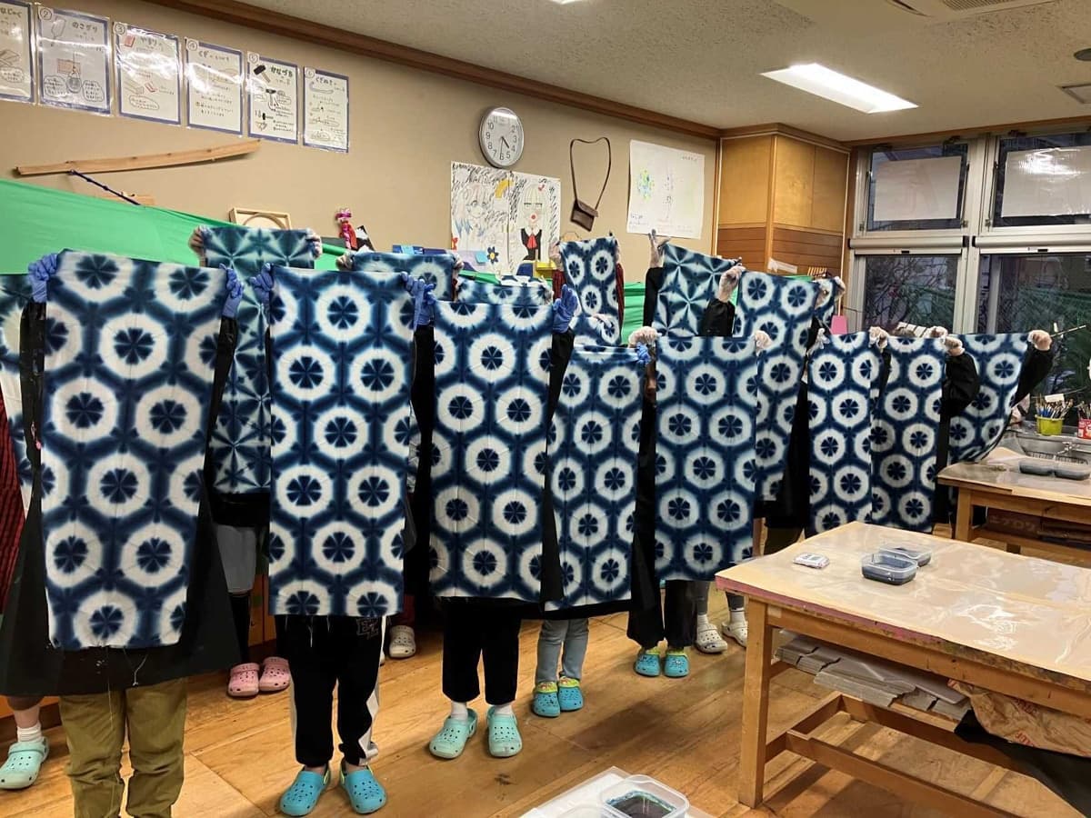 藍の香り、雪花絞りの柄選び、酸化還元による色の変化など、各工程で目を輝かせながら、伝統文化に触れてもらうことができました。