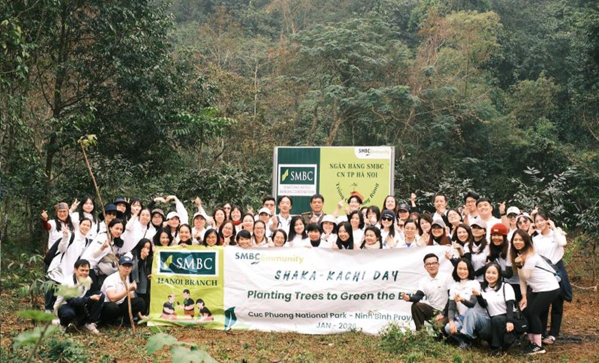 On January 24, SMBC Hanoi’s HNI branch held its second annual tree planting at Cuc Phuong National Park, planting 300 trees including rare Tau (Vatica subglabra) and valuable Kim Giao (Nageia fleuryi). This initiative supports climate change by enhancing carbon sequestration, restoring biodiversity, improving ecosystems, and soil erosion prevention.